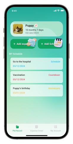 Never miss important dates again! Schedule anniversaries, countdowns, and other events related to your pets, and get reminders so you remain on track.