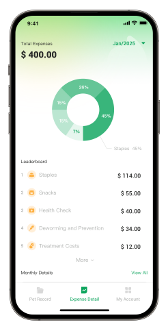 Get insightful analytics with pie charts that give you a clear view of your spending habits and pet care costs.